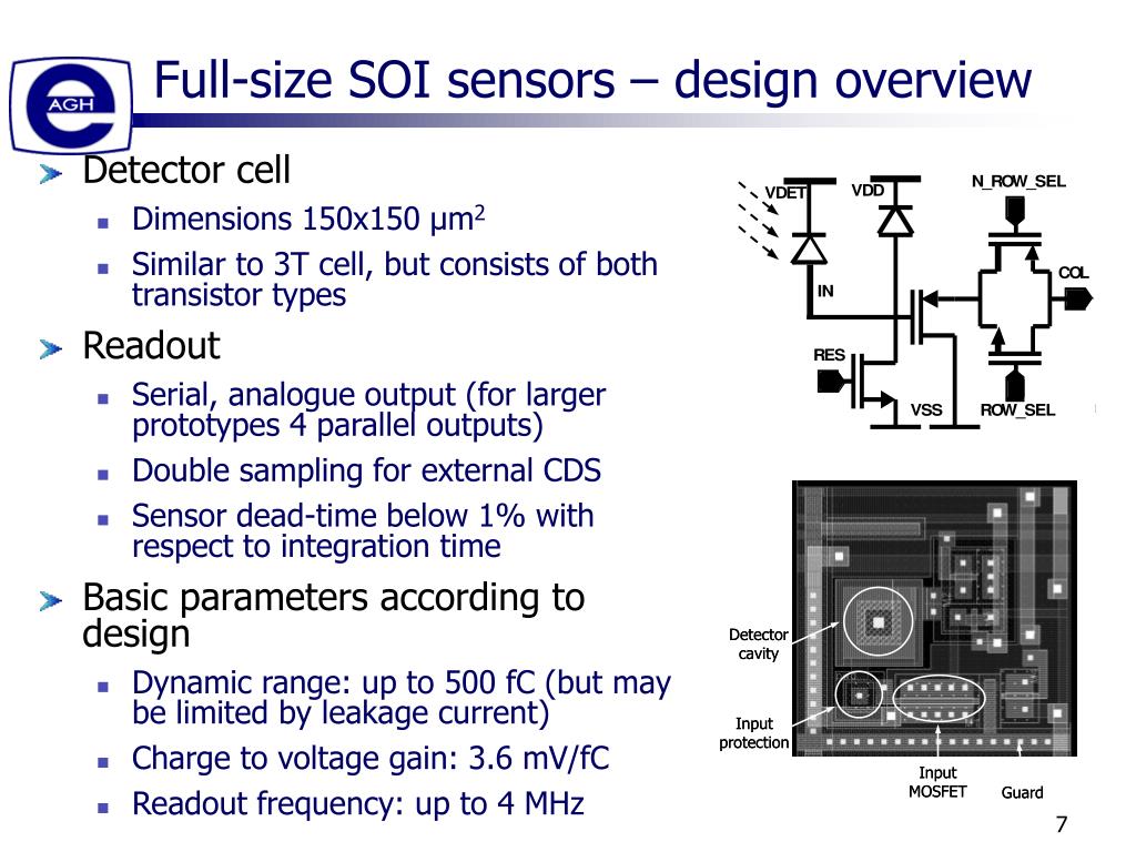 Full-size SOI sensors – design overview • Detector cell • Dimensions 150x150 µm2 • Similar to 3T cell, but consists of both transistor types • Readout • Serial, analogue output (for larger prototypes 4 parallel outputs) • Double sampling for external CDS • Sensor dead-time below 1% with respect to integration time • Basic parameters according to design • Dynamic range: up to 500 fC (but may be limited by leakage current) • Charge to voltage gain: 3.6 mV/fC • Readout frequency: up to 4 MHz