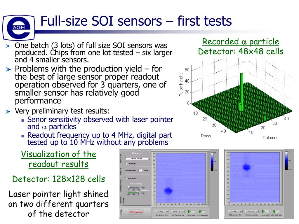 Full-size SOI sensors – first tests Recorded particle Detector: 48x48 cells • One batch (3 lots) of full size SOI sensors was produced. Chips from one lot tested – six larger and 4 smaller sensors. • Problems with the production yield – for the best of large sensor proper readout operation observed for 3 quarters, one of smaller sensor has relatively good performance • Very preliminary test results: • Senor sensitivity observed with laser pointer and particles • Readout frequency up to 4 MHz, digital part tested up to 10 MHz without any problems Visualization of the readout results Detector: 128x128 cells Laser pointer light shined on two different quarters of the detector
