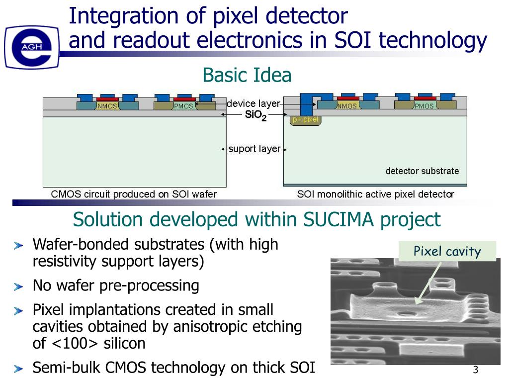 Pixel cavity Integration of pixel detector and readout electronics in SOI technology Basic Idea • Wafer-bonded substrates (with high resistivity support layers) • No wafer pre-processing • Pixel implantations created in small cavities obtained by anisotropic etching of <100> silicon • Semi-bulk CMOS technology on thick SOI Solution developed within SUCIMA project