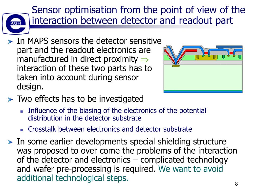 Sensor optimisation from the point of view of the interaction between detector and readout part • In MAPS sensors the detector sensitive part and the readout electronics are manufactured in direct proximity interaction of these two parts has to taken into account during sensor design. • Two effects has to be investigated • Influence of the biasing of the electronics of the potential distribution in the detector substrate • Crosstalk between electronics and detector substrate • In some earlier developments special shielding structure was proposed to over come the problems of the interaction of the detector and electronics – complicated technology and wafer pre-processing is required. We want to avoid additional technological steps.