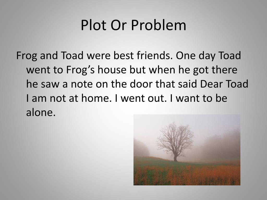 Plot Or Problem Frog and Toad were best friends. One day Toad went to Frog’s house but when he got there he saw a note on the door that said Dear Toad I am not at home. I went out. I want to be alone.