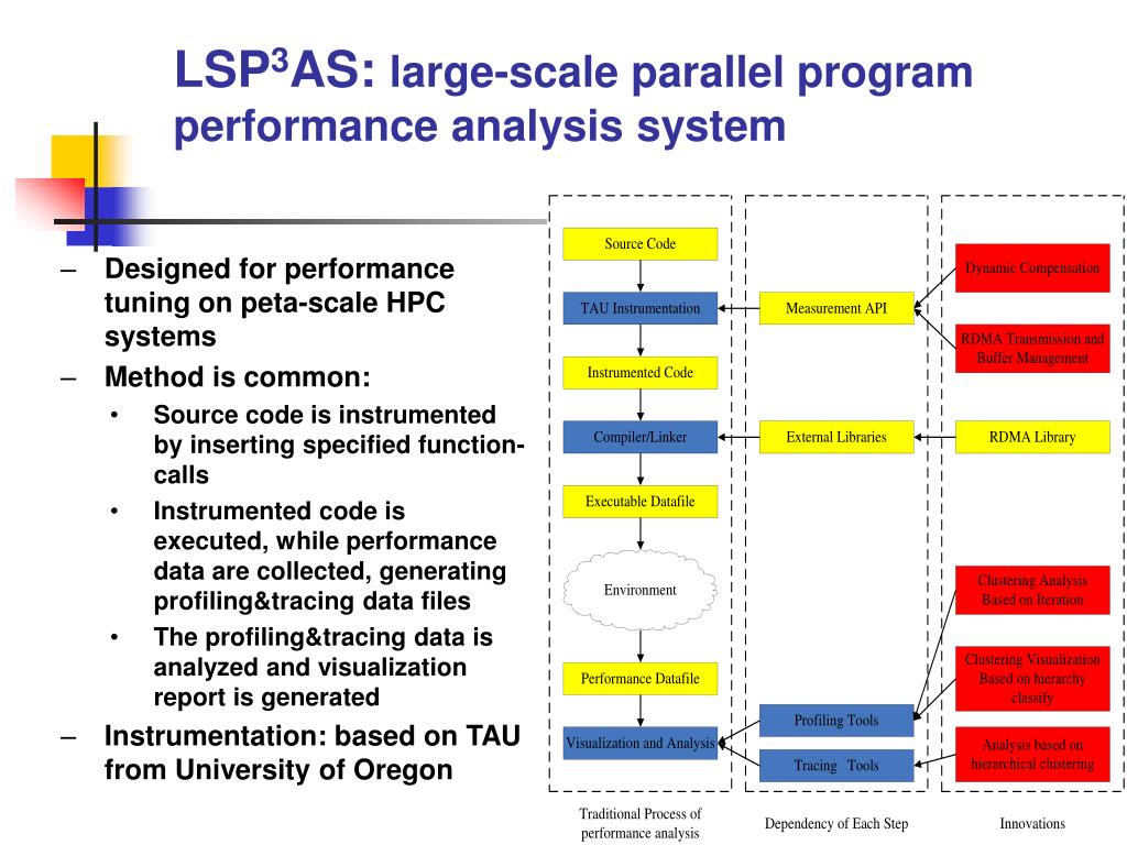 LSP3AS: large-scale parallel program performance analysis system • Designed for performance tuning on peta-scale HPC systems • Method is common: • Source code is instrumented by inserting specified function-calls • Instrumented code is executed, while performance data are collected, generating profiling&tracing data files • The profiling&tracing data is analyzed and visualization report is generated • Instrumentation: based on TAU from University of Oregon