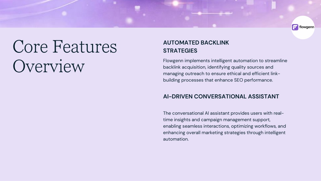 2. Core Features Overview • AUTOMATED BACKLINK STRATEGIES • Flowgenn implements intelligent automation to streamline backlink acquisition, identifying quality sources and managing outreach to ensure ethical and efficient link-building processes that enhance SEO performance. • AI-DRIVEN CONVERSATIONAL ASSISTANT • The conversational AI assistant provides users with real-time insights and campaign management support, enabling seamless interactions, optimizing workflows, and enhancing overall marketing strategies through intelligent automation.