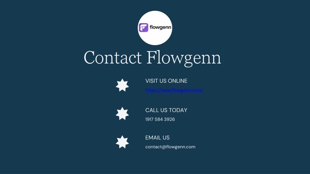 8. EMAIL US • CALL US TODAY • VISIT US ONLINE • contact@flowgenn.com • 1917 584 3926 • https://www.flowgenn.com/ • Contact Flowgenn