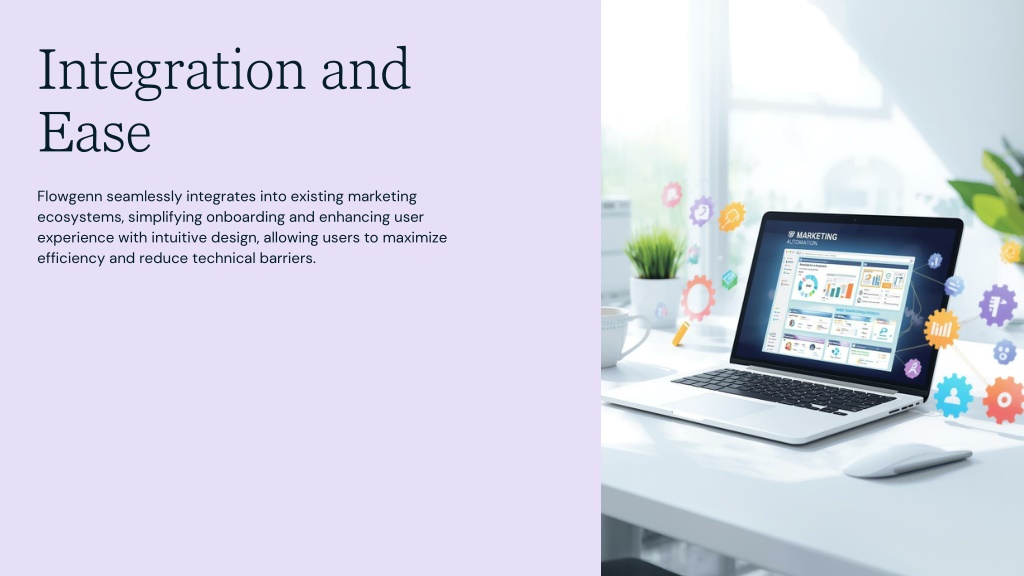 7. Integration and Ease • Flowgenn seamlessly integrates into existing marketing ecosystems, simplifying onboarding and enhancing user experience with intuitive design, allowing users to maximize efficiency and reduce technical barriers.
