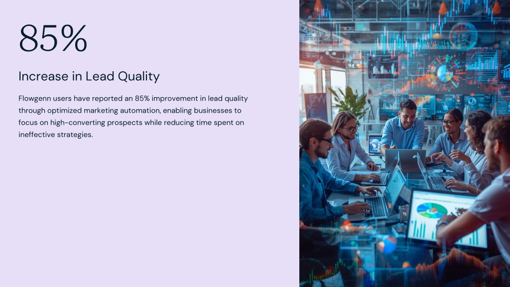 6. 85% • Increase in Lead Quality • Flowgenn users have reported an 85% improvement in lead quality through optimized marketing automation, enabling businesses to focus on high-converting prospects while reducing time spent on ineffective strategies.
