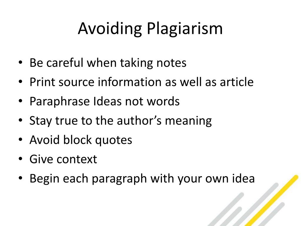 Avoiding Plagiarism • Be careful when taking notes • Print source information as well as article • Paraphrase Ideas not words • Stay true to the author’s meaning • Avoid block quotes • Give context • Begin each paragraph with your own idea