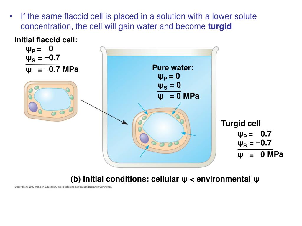 If the same flaccid cell is placed in a solution with a lower solute concentration, the cell will gain water and become turgid Initial flaccid cell: ψP = 0ψS = −0.7 Pure water: ψ= −0.7 MPa ψP = 0ψS = 0 ψ= 0 MPa Turgid cell ψP = 0.7ψS = −0.7 ψ = 0 MPa (b) Initial conditions: cellular ψ < environmental ψ