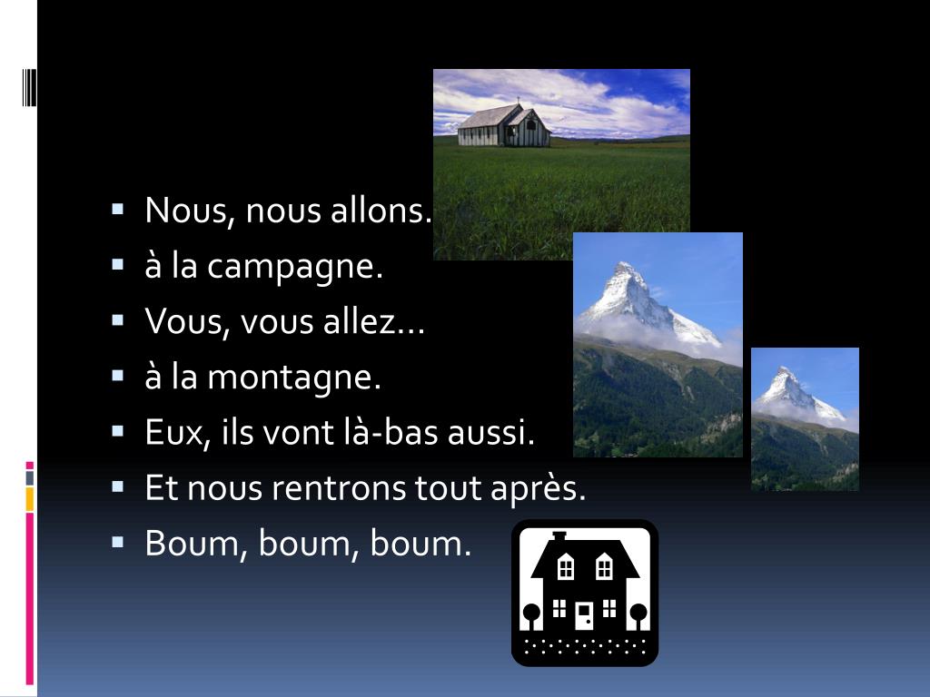 Nous, nous allons… • à la campagne. • Vous, vousallez… • à la montagne. • Eux, ilsvontlà-bas aussi. • Et nous rentrons tout après. • Boum, boum, boum.
