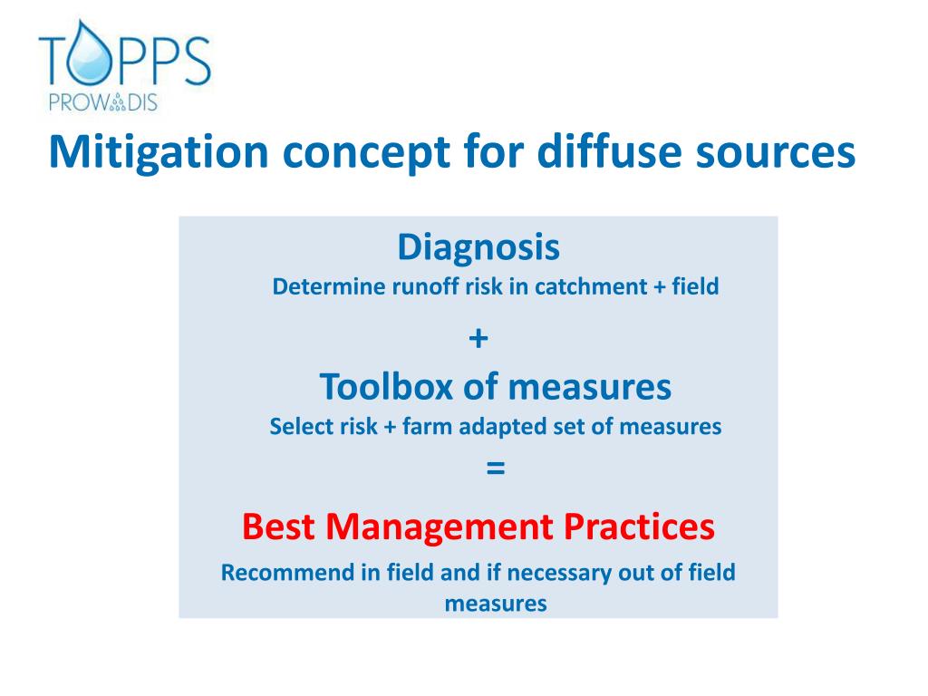 Mitigation concept for diffuse sources DiagnosisDetermine runoff risk in catchment + field +Toolbox of measuresSelect risk + farm adapted set of measures= Best Management Practices Recommend in field and if necessary out of field measures