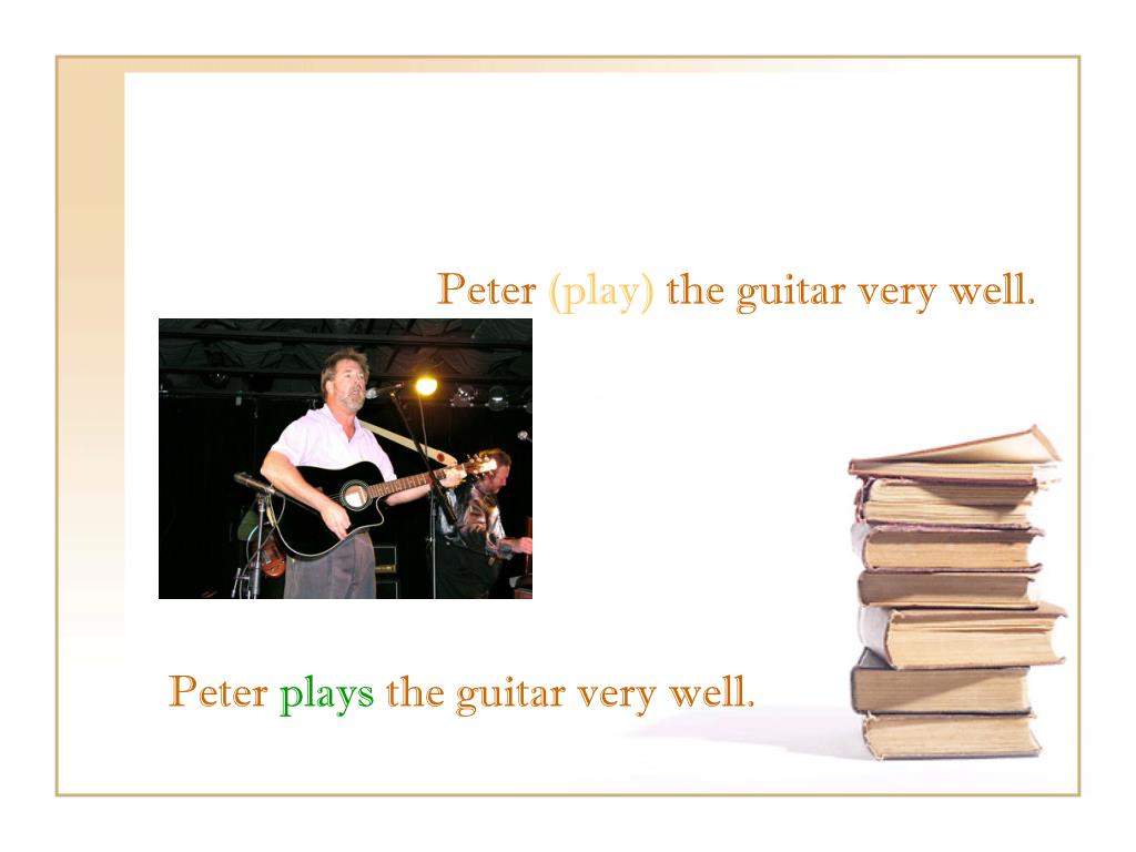 Peter (play) the guitar very well. Peter plays the guitar very well.