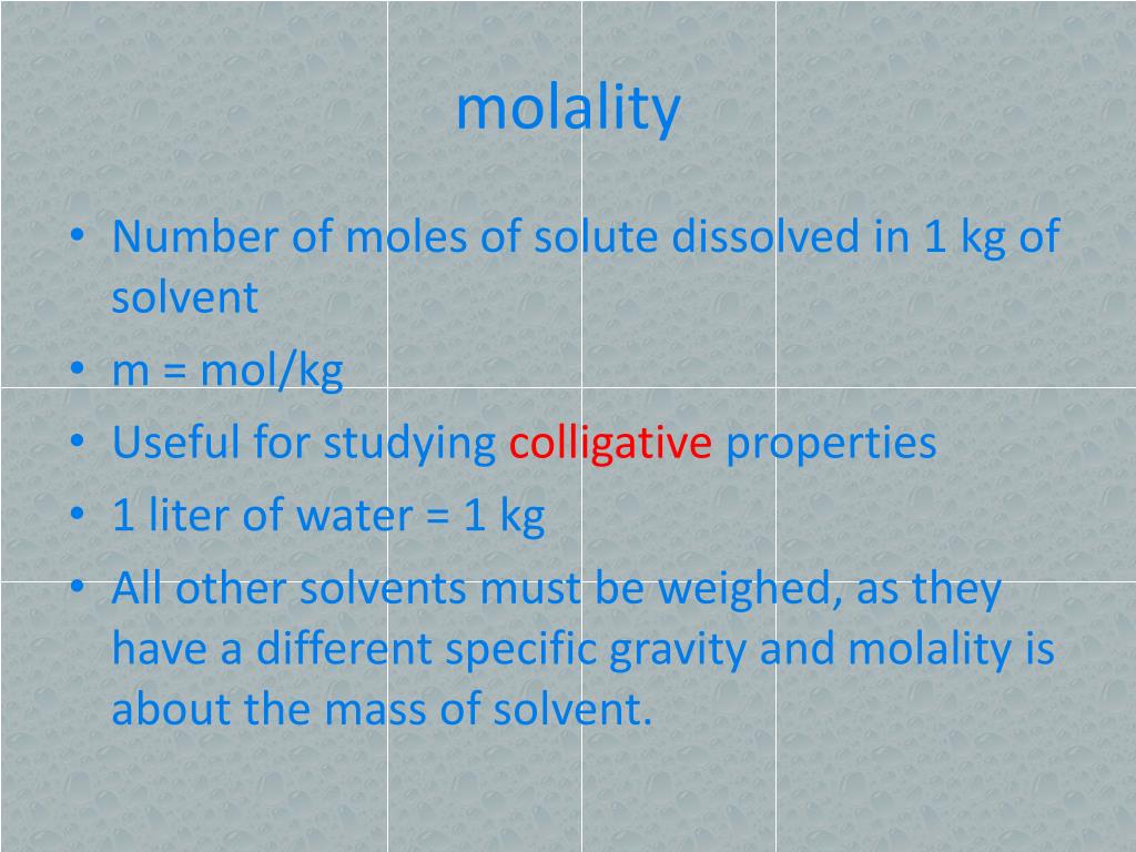 molality • Number of moles of solute dissolved in 1 kg of solvent • m = mol/kg • Useful for studying colligative properties • 1 liter of water = 1 kg • All other solvents must be weighed, as they have a different specific gravity and molality is about the mass of solvent.