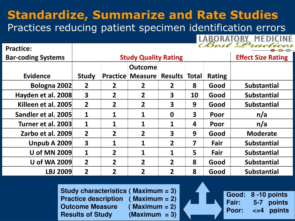 Standardize, Summarize and Rate StudiesPractices reducing patient specimen identification errors Study characteristics ( Maximum = 3) Practice description ( Maximum = 2) Outcome Measure ( Maximum = 2) Results of Study (Maximum = 3) Good: 8 -10 points Fair: 5-7 points Poor: <=4 points