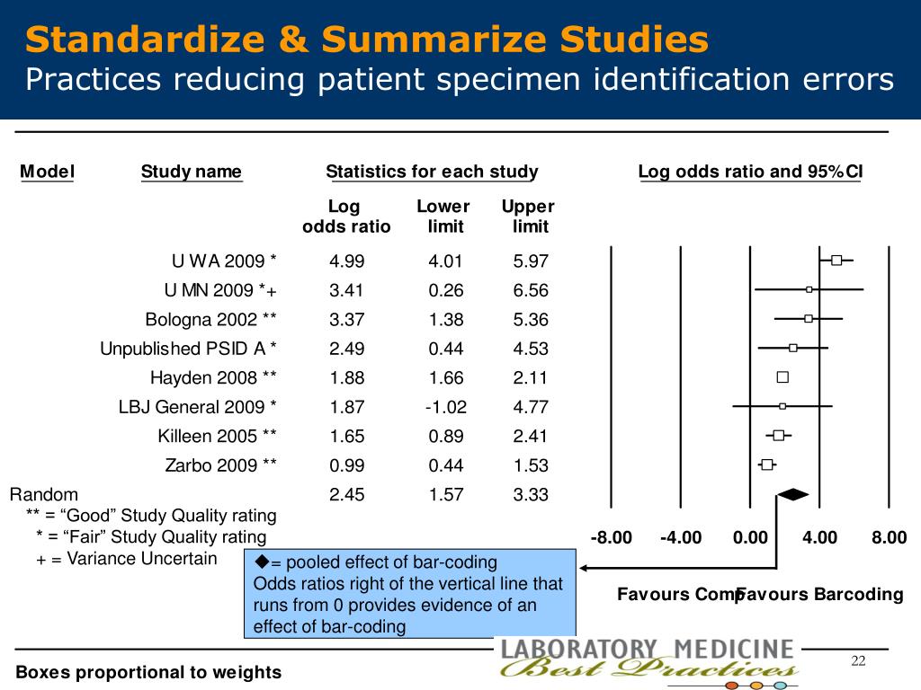 Standardize & Summarize StudiesPractices reducing patient specimen identification errors ** = “Good” Study Quality rating * = “Fair” Study Quality rating + = Variance Uncertain = pooled effect of bar-coding Odds ratios right of the vertical line that runs from 0 provides evidence of an effect of bar-coding