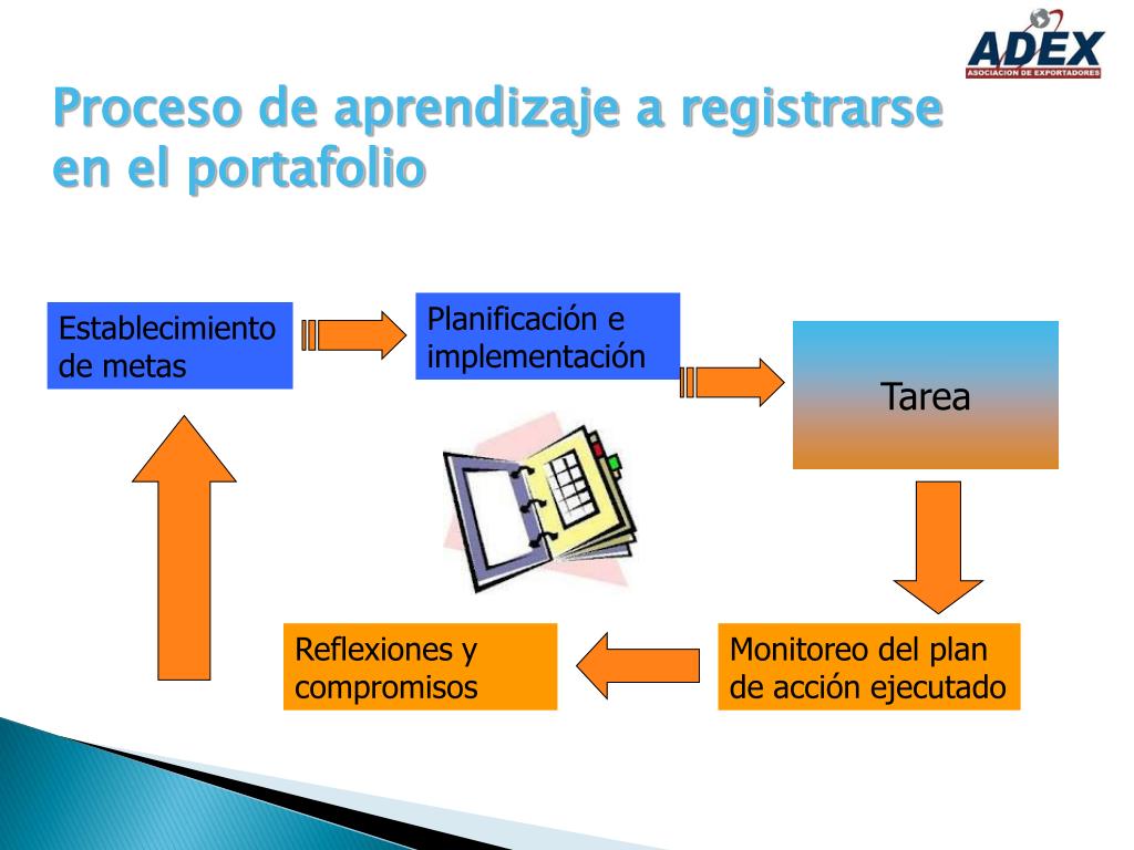 Proceso de aprendizaje a registrarse en el portafolio Planificación e implementación Establecimiento de metas Tarea Reflexiones y compromisos Monitoreo del plan de acción ejecutado