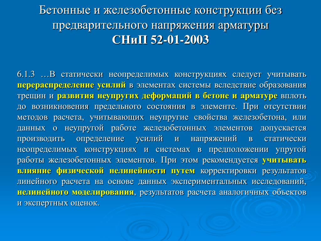 Бетонные и железобетонные конструкции без предварительного напряжения арматуры СНиП 52-01-2003 6.1.3 …В статически неопределимых конструкциях следует учитывать перераспределение усилий в элементах системы вследствие образования трещин и развития неупругих деформаций в бетоне и арматуре вплоть до возникновения предельного состояния в элементе. При отсутствии методов расчета, учитывающих неупругие свойства железобетона, или данных о неупругой работе железобетонных элементов допускается производить определение усилий и напряжений в статически неопределимых конструкциях и системах в предположении упругой работы железобетонных элементов. При этом рекомендуется учитывать влияние физической нелинейности путем корректировки результатов линейного расчета на основе данных экспериментальных исследований, нелинейного моделирования, результатов расчета аналогичных объектов и экспертных оценок.