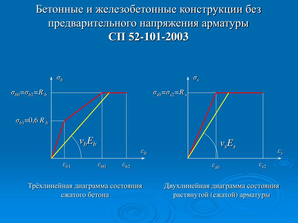 Бетонные и железобетонные конструкции без предварительного напряжения арматуры СП 52-101-2003 5.1.21 При расчете прочности железобетонных элементов по нелинейной деформационной модели для определения напряженно-деформированного состояния сжатой зоны бетона используют диаграммы состояния сжатого бетона, приведенные в 5.1.18 и 5.1.19 с деформационными характеристиками, отвечающими непродол-жительному действию нагрузки…