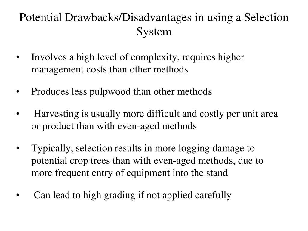 Potential Objectives/Benefits in Using a Selection System • Maintains high diversity within the stand • usually provides good wildlife habitat for many, but not all species • Maintains good site protection • although frequent logging may result in increased soil damage on sensitive sites • Maintains pleasing aesthetics without time gaps