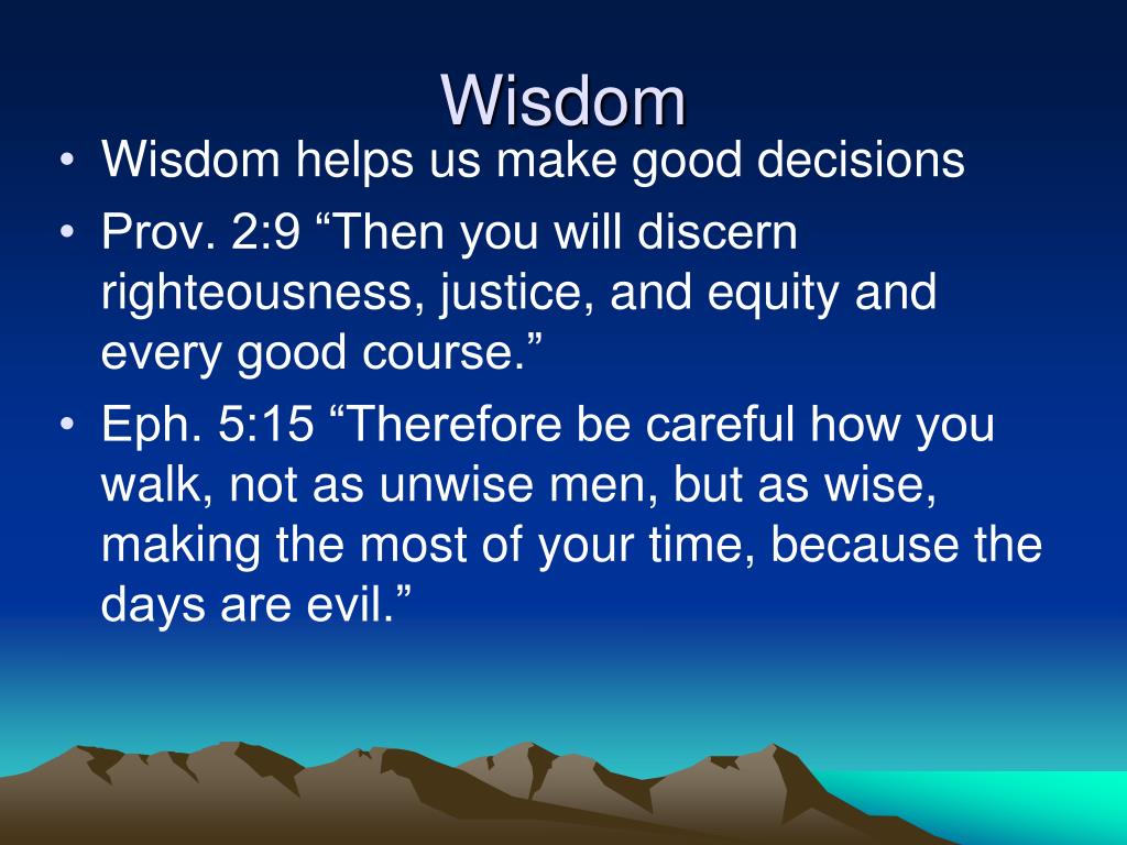 Wisdom • Wisdom helps us make good decisions • Prov. 2:9 “Then you will discern righteousness, justice, and equity and every good course.” • Eph. 5:15 “Therefore be careful how you walk, not as unwise men, but as wise, making the most of your time, because the days are evil.”