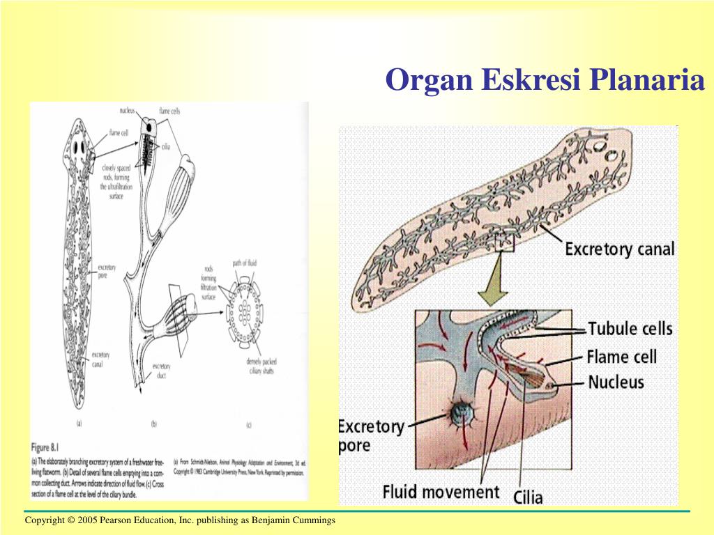 Mulut —tempat masuknya makanan, terletak di bagian ventral. Pada mulut, terdapat saluran yang dapat dijulurkan yang disebut faring untuk menyedot makanan. Saluran pencernaan —mencerna makanan berbentuk huruf Y terbalik Bintik Mata —alat indera digunakan untuk mendeteksi cahaya (planaria menyukai gelap) Aurikel —organ penciuman Protonephridia— yaitu saluran yang menghubungkan pori-pori dengan sel api sebagai organ eskresi Struktur Tubuh Planaria Aurikel