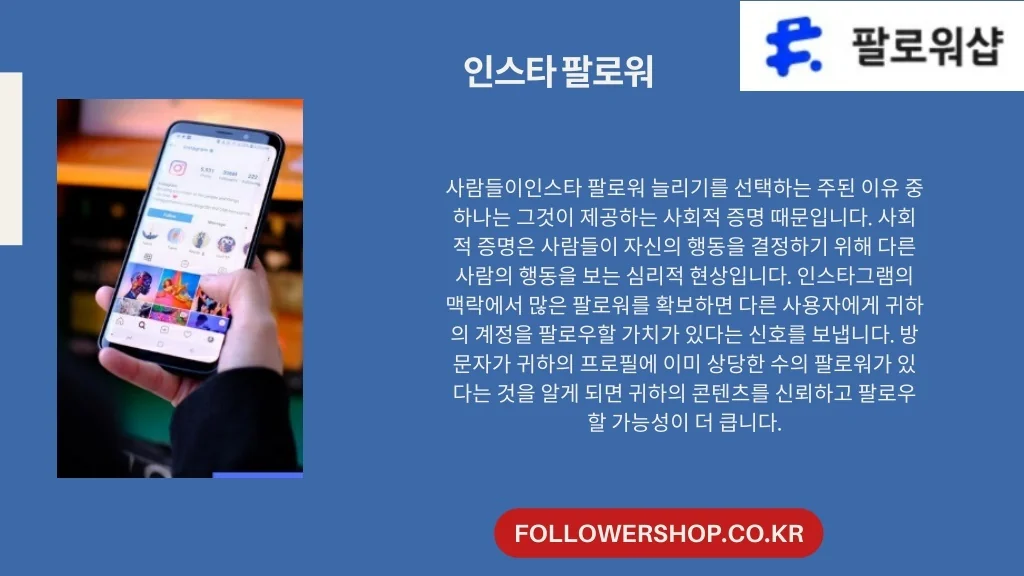 인스타팔로워 사람들이인스타팔로워늘리기를선택하는주된이유중 하나는그것이제공하는사회적증명때문입니다. 사회 적증명은사람들이자신의행동을결정하기위해다른 사람의행동을보는심리적현상입니다. 인스타그램의 맥락에서많은팔로워를확보하면다른사용자에게귀하 의계정을팔로우할가치가있다는신호를보냅니다. 방 문자가귀하의프로필에이미상당한수의팔로워가있 다는것을알게되면귀하의콘텐츠를신뢰하고팔로우 할가능성이더큽니다. FOLLOWERSHOP.CO.KR