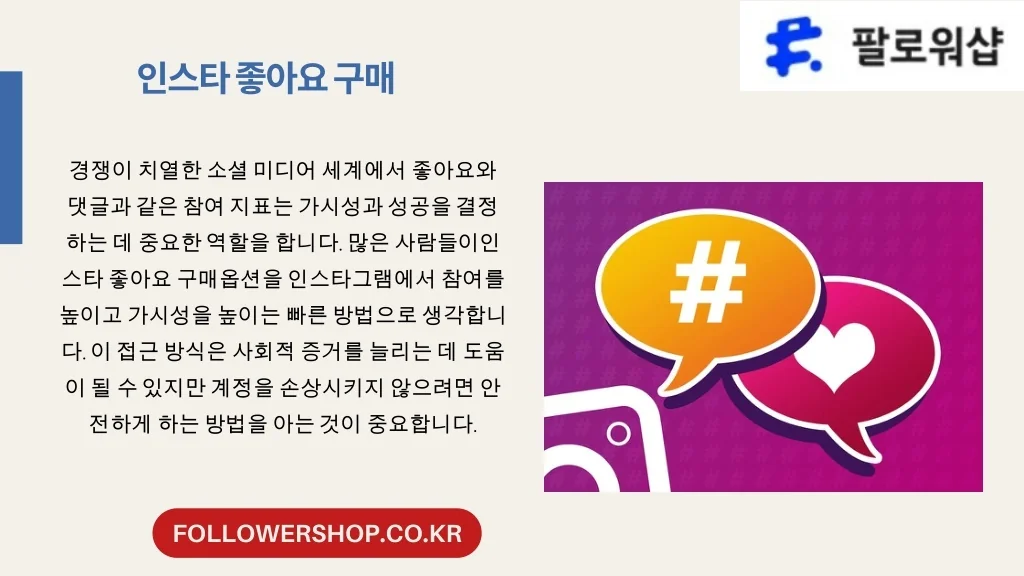인스타좋아요구매 경쟁이치열한소셜미디어세계에서좋아요와 댓글과같은참여지표는가시성과성공을결정 하는데중요한역할을합니다. 많은사람들이인 스타좋아요구매옵션을인스타그램에서참여를 높이고가시성을높이는빠른방법으로생각합니 다. 이접근방식은사회적증거를늘리는데도움 이될수있지만계정을손상시키지않으려면안 전하게하는방법을아는것이중요합니다. FOLLOWERSHOP.CO.KR