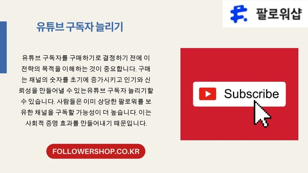유튜브구독자늘리기 유튜브구독자를구매하기로결정하기전에이 전략의목적을이해하는것이중요합니다. 구매 는채널의숫자를초기에증가시키고인기와신 뢰성을만들어낼수있는유튜브구독자늘리기할 수있습니다. 사람들은이미상당한팔로워를보 유한채널을구독할가능성이더높습니다. 이는 사회적증명효과를만들어내기때문입니다. FOLLOWERSHOP.CO.KR