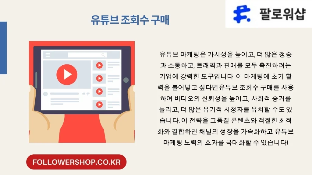 유튜브조회수구매 유튜브마케팅은가시성을높이고, 더많은청중 과소통하고, 트래픽과판매를모두촉진하려는 기업에강력한도구입니다. 이마케팅에초기활 력을불어넣고싶다면유튜브조회수구매를사용 하여비디오의신뢰성을높이고, 사회적증거를 늘리고, 더많은유기적시청자를유치할수도있 습니다. 이전략을고품질콘텐츠와적절한최적 화와결합하면채널의성장을가속화하고유튜브 마케팅노력의효과를극대화할수있습니다! FOLLOWERSHOP.CO.KR