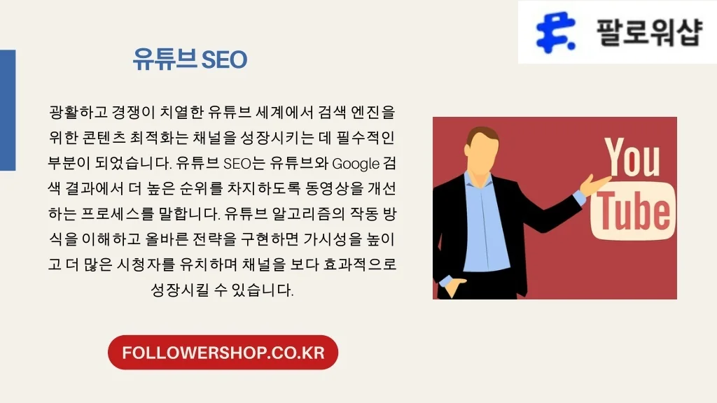 유튜브 SEO 광활하고경쟁이치열한유튜브세계에서검색엔진을 위한콘텐츠최적화는채널을성장시키는데필수적인 부분이되었습니다. 유튜브 SEO는유튜브와 Google 검 색결과에서더높은순위를차지하도록동영상을개선 하는프로세스를말합니다. 유튜브알고리즘의작동방 식을이해하고올바른전략을구현하면가시성을높이 고더많은시청자를유치하며채널을보다효과적으로 성장시킬수있습니다. FOLLOWERSHOP.CO.KR