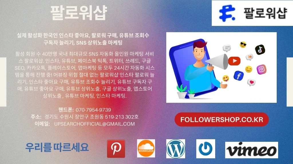 팔로워샵 팔로워샵 실제활성화한국인인스타좋아요, 팔로워구매, 유튜브조회수 구독자늘리기, SNS 상위노출마케팅 활성회원수 40만명국내최대규모 SNS 자동화올인원마케팅서비 스팔로워샵. 인스타, 유튜브, 페이스북틱톡, 트위터, 쓰레드, 구글 SEO, 카카오톡, 플레이스토어, 앱마케팅등모두 24시간자동화시스 템을통해진행중! 어뷰징위험절대없는팔로워샵인스타팔로워늘 리기, 인스타좋아요구매, 유튜브조회수늘리기, 유튜브구독자구 매, 유튜브좋아요구매, 유튜브상위노출, 구글상위노출, 앱스토어 상위노출 , 유튜브마케팅, 인스타마케팅. 핸드폰: 070-7954-9739 주소: 경기도수원시장안구조원동 519-213 302호 이메일: UPSEARCHOFFICIAL@GMAIL.COM FOLLOWERSHOP.CO.KR 우리를따르세요
