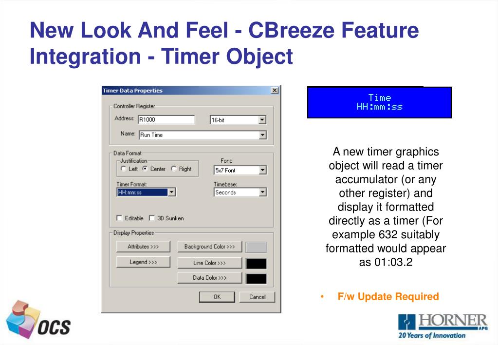 New Look And Feel - CBreeze Feature Integration - Timer Object A new timer graphics object will read a timer accumulator (or any other register) and display it formatted directly as a timer (For example 632 suitably formatted would appear as 01:03.2 • F/w Update Required