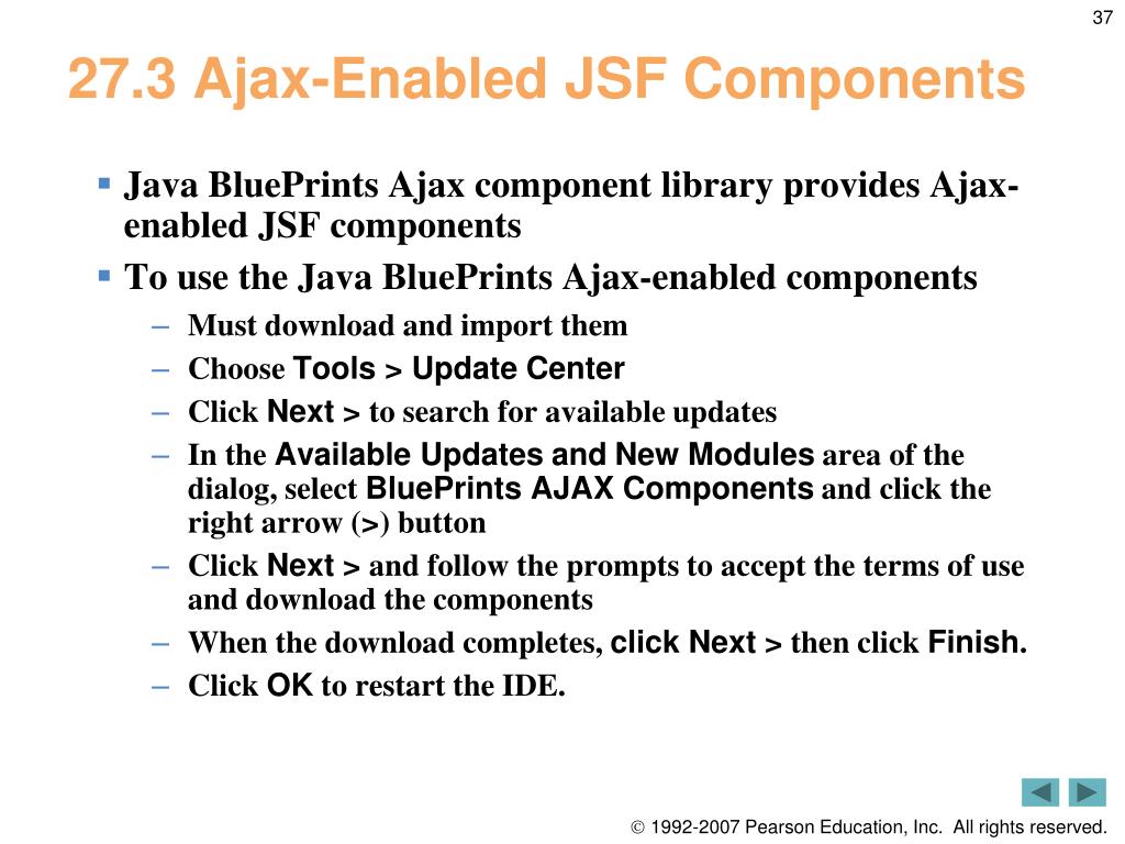 27.3 Ajax-Enabled JSF Components • Java BluePrints Ajax component library provides Ajax-enabled JSF components • To use the Java BluePrints Ajax-enabled components • Must download and import them • Choose Tools > Update Center • Click Next > to search for available updates • In the Available UpdatesandNew Modules area of the dialog, select BluePrints AJAX Components and click the right arrow (>) button • Click Next > and follow the prompts to accept the terms of use and download the components • When the download completes, click Next > then click Finish. • Click OK to restart the IDE.