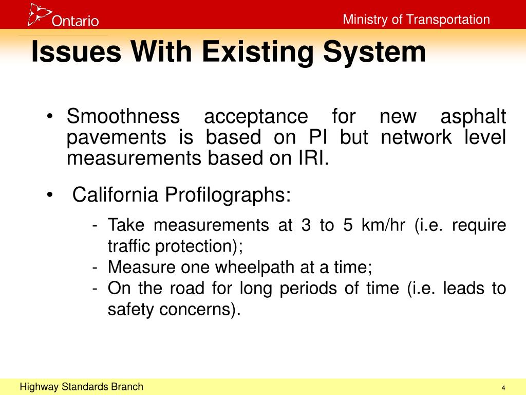 Issues With Existing System • Smoothness acceptance for new asphalt pavements is based on PI but network level measurements based on IRI. • California Profilographs: • - Take measurements at 3 to 5 km/hr (i.e. require traffic protection); • - Measure one wheelpath at a time; • - On the road for long periods of time (i.e. leads to safety concerns).
