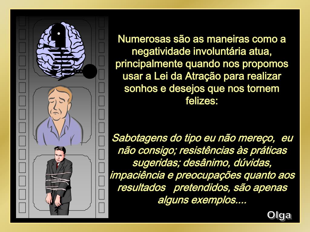 Numerosas são as maneiras como a negatividade involuntária atua, principalmente quando nos propomos usar a Lei da Atração para realizar sonhos e desejos que nos tornem felizes: Sabotagens do tipo eu não mereço, eu não consigo; resistências às práticas sugeridas; desânimo, dúvidas, impaciência e preocupações quanto aos resultados pretendidos, são apenas alguns exemplos.... Olga