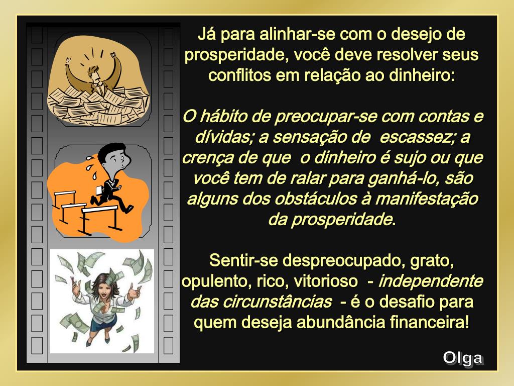 Já para alinhar-se com o desejo de prosperidade, você deve resolver seus conflitos em relação ao dinheiro: O hábito de preocupar-se com contas e dívidas; a sensação de escassez; a crença de que o dinheiro é sujo ou que você tem de ralar para ganhá-lo, são alguns dos obstáculos à manifestação da prosperidade. Sentir-se despreocupado, grato, opulento, rico, vitorioso - independente das circunstâncias - é o desafio para quem deseja abundância financeira! Olga