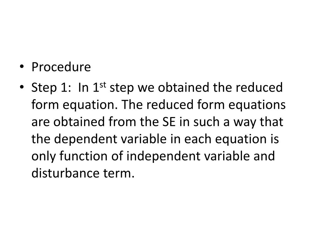 Procedure • Step 1: In 1st step we obtained the reduced form equation. The reduced form equations are obtained from the SE in such a way that the dependent variable in each equation is only function of independent variable and disturbance term.