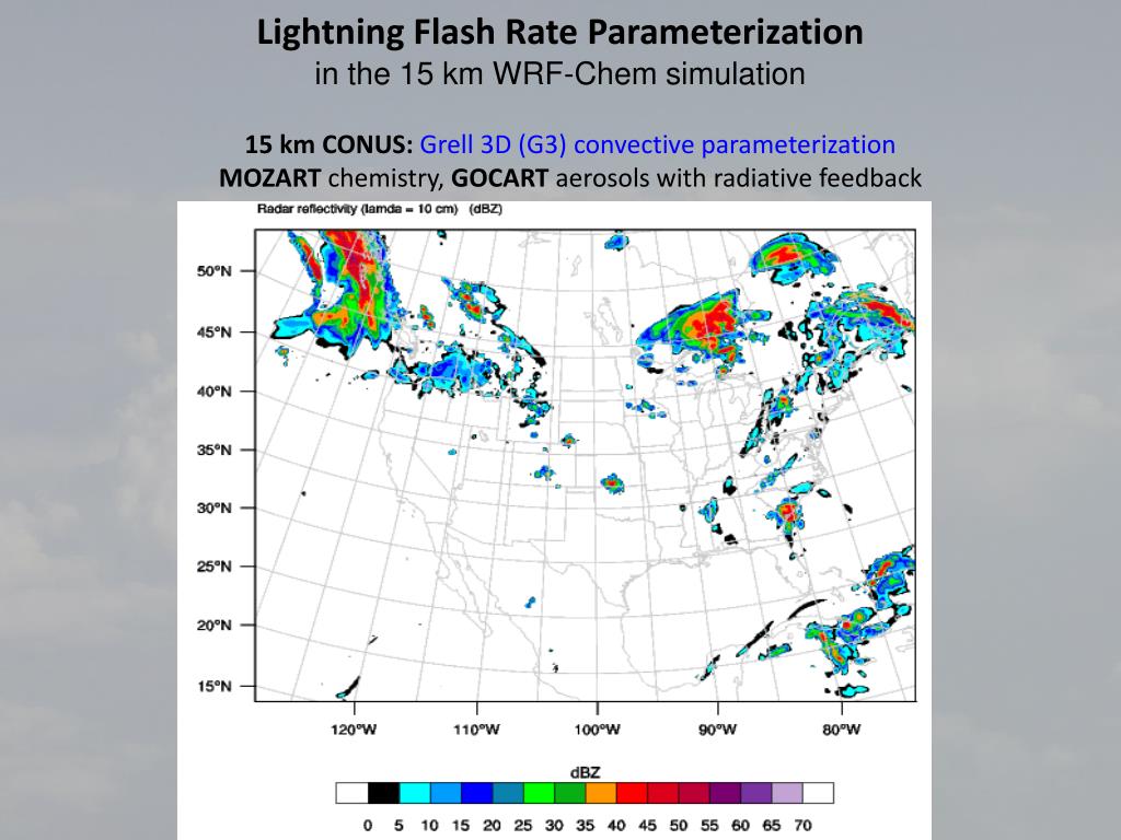 Lightning Flash Rate Parameterizationin the 15 km WRF-Chem simulation 15 km CONUS: Grell 3D (G3) convective parameterization MOZARTchemistry, GOCART aerosols with radiative feedback