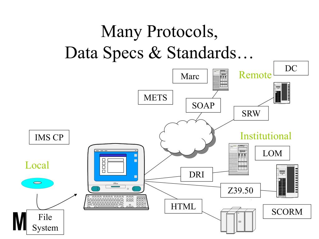 I D C I D C i M a c B M Many Protocols, Data Specs & Standards… DC Remote Marc METS SOAP SRW Institutional IMS CP LOM Local DRI Z39.50 HTML I SCORM File System