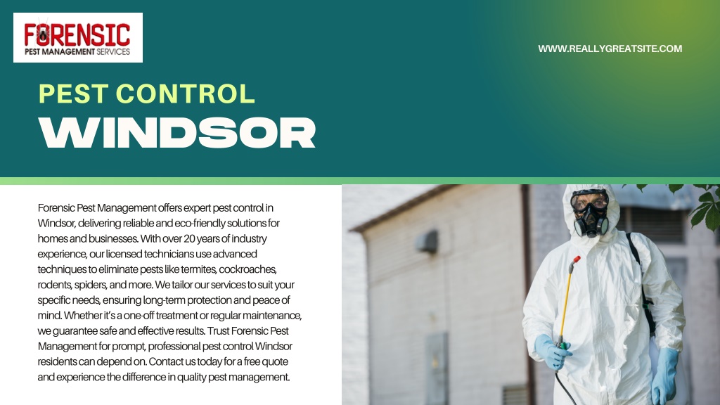 WWW.REALLYGREATSITE.COM PEST CONTROL WINDSOR Forensic Pest Management offers expert pest control in Windsor, delivering reliable and eco-friendly solutions for homes and businesses. With over 20 years of industry experience, our licensed technicians use advanced techniques to eliminate pests like termites, cockroaches, rodents, spiders, and more. We tailor our services to suit your specific needs, ensuring long-term protection and peace of mind. Whether it’s a one-off treatment or regular maintenance, we guarantee safe and effective results. Trust Forensic Pest Management for prompt, professional pest control Windsor residents can depend on. Contact us today for a free quote and experience the difference in quality pest management.