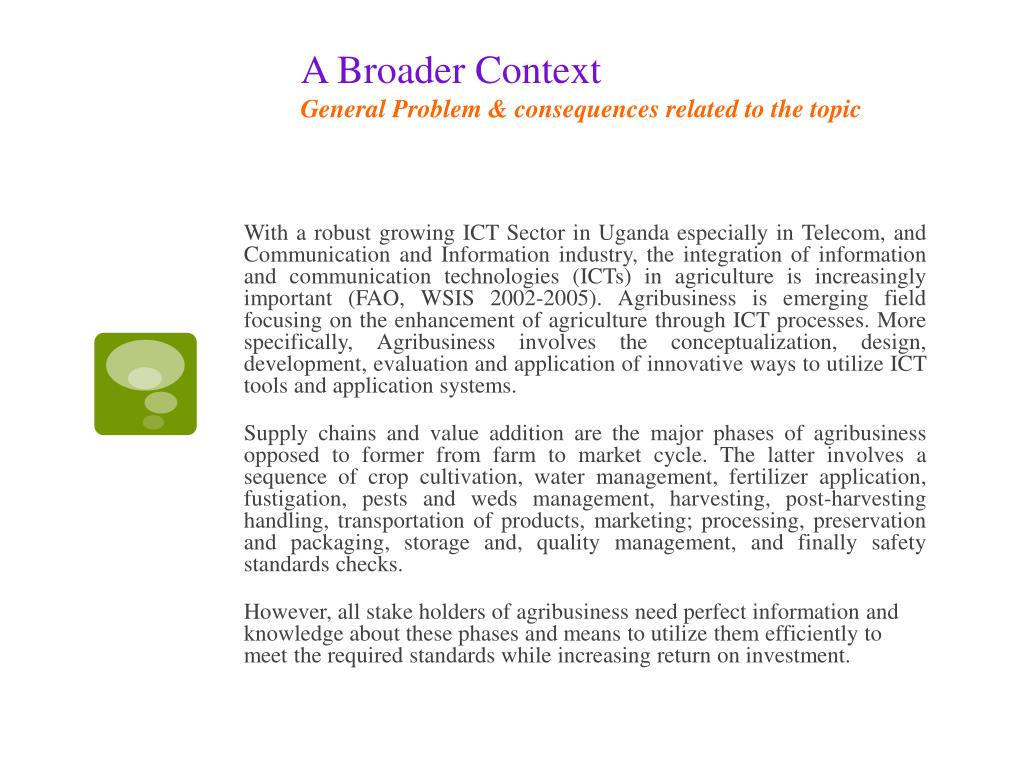 A Broader ContextGeneral Problem & consequences related to the topic With a robust growing ICT Sector in Uganda especially in Telecom, and Communication and Information industry, the integration of information and communication technologies (ICTs) in agriculture is increasingly important (FAO, WSIS 2002-2005). Agribusiness is emerging field focusing on the enhancement of agriculture through ICT processes. More specifically, Agribusiness involves the conceptualization, design, development, evaluation and application of innovative ways to utilize ICT tools and application systems. Supply chains and value addition are the major phases of agribusiness opposed to former from farm to market cycle. The latter involves a sequence of crop cultivation, water management, fertilizer application, fustigation, pests and weds management, harvesting, post-harvesting handling, transportation of products, marketing; processing, preservation and packaging, storage and, quality management, and finally safety standards checks. However, all stake holders of agribusiness need perfect information and knowledge about these phases and means to utilize them efficiently to meet the required standards while increasing return on investment.