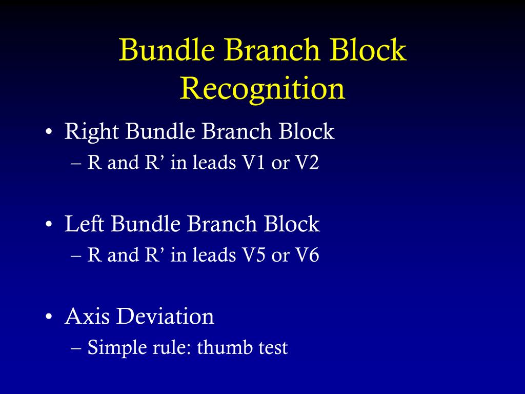 Bundle Branch Block Recognition • Right Bundle Branch Block • R and R’ in leads V1 or V2 • Left Bundle Branch Block • R and R’ in leads V5 or V6 • Axis Deviation • Simple rule: thumb test