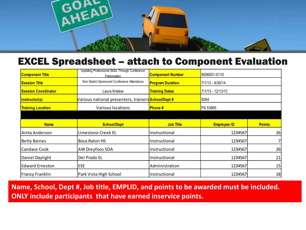 EXCEL Spreadsheet – attach to Component Evaluation Name, School, Dept #, Job title, EMPLID, and points to be awarded must be included. ONLY include participants that have earned inservice points.