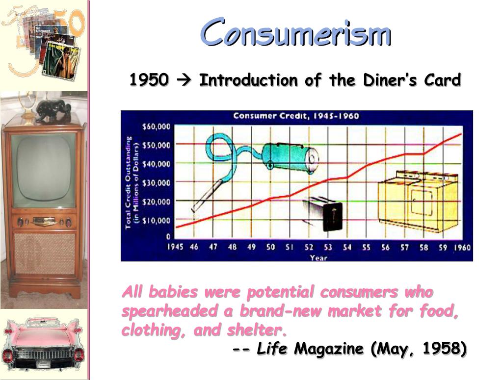 Consumerism 1950 Introduction of the Diner’s Card All babies were potential consumers who spearheaded a brand-new market for food, clothing, and shelter. -- Life Magazine (May, 1958)