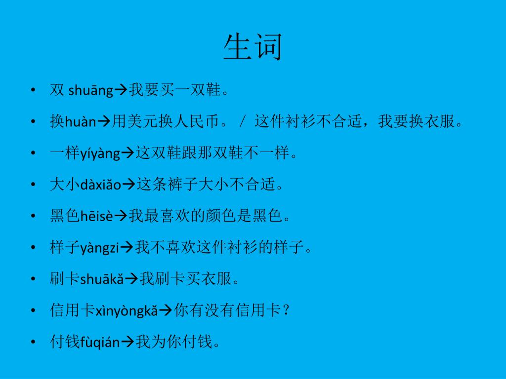 生词 • 双 shuāng我要买一双鞋。 • 换huàn用美元换人民币。/ 这件衬衫不合适,我要换衣服。 • 一样yíyàng这双鞋跟那双鞋不一样。 • 大小dàxiăo这条裤子大小不合适。 • 黑色hēisè我最喜欢的颜色是黑色。 • 样子yàngzi我不喜欢这件衬衫的样子。 • 刷卡shuākă我刷卡买衣服。 • 信用卡xìnyòngkă你有没有信用卡? • 付钱fùqián我为你付钱。
