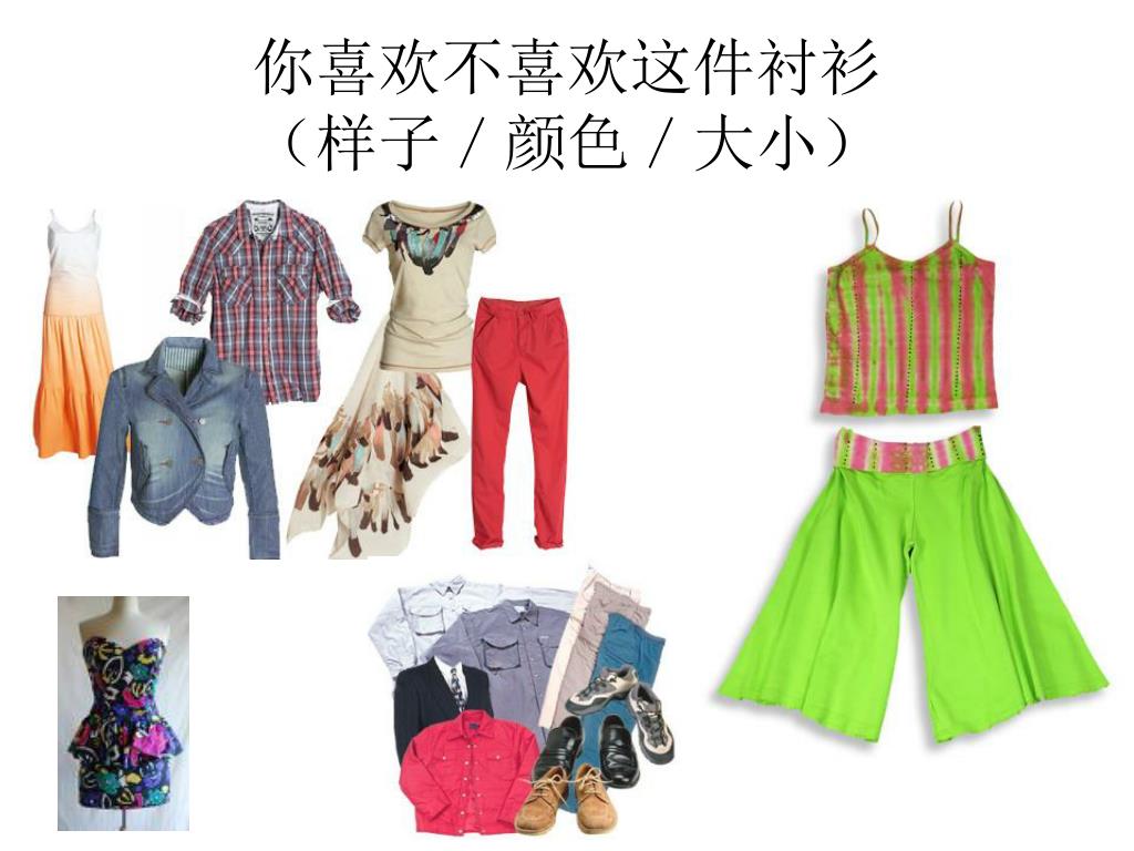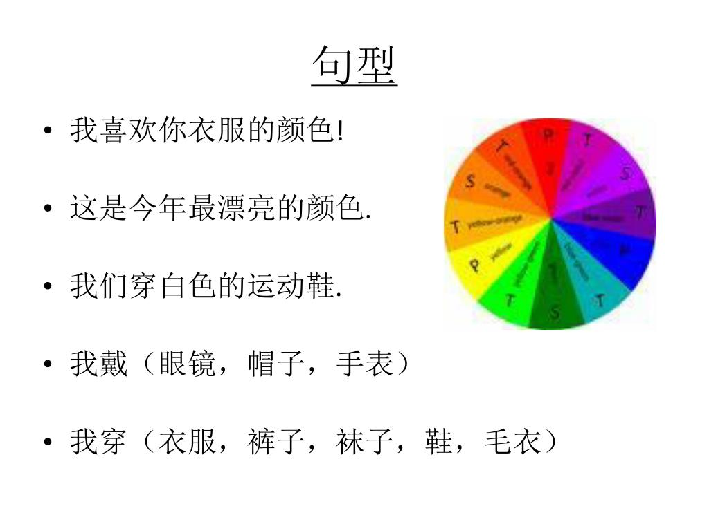 句型 • 我喜欢你衣服的颜色! • 这是今年最漂亮的颜色. • 我们穿白色的运动鞋. • 我戴(眼镜,帽子,手表) • 我穿(衣服,裤子,袜子,鞋,毛衣)