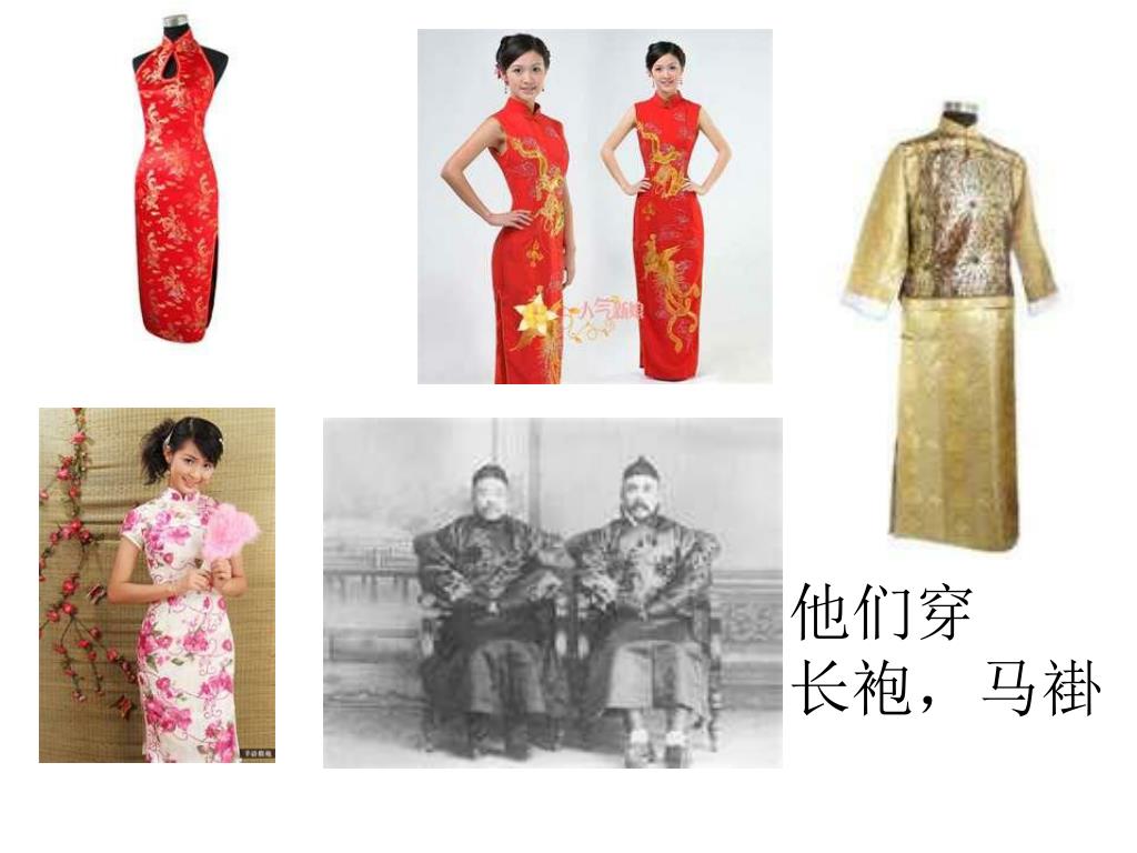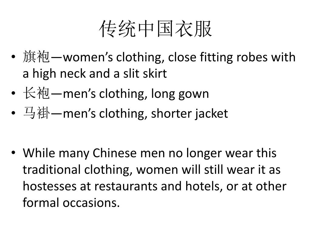 传统中国衣服 • 旗袍—women’s clothing, close fitting robes with a high neck and a slit skirt • 长袍—men’s clothing, long gown • 马褂—men’s clothing, shorter jacket • While many Chinese men no longer wear this traditional clothing, women will still wear it as hostesses at restaurants and hotels, or at other formal occasions.