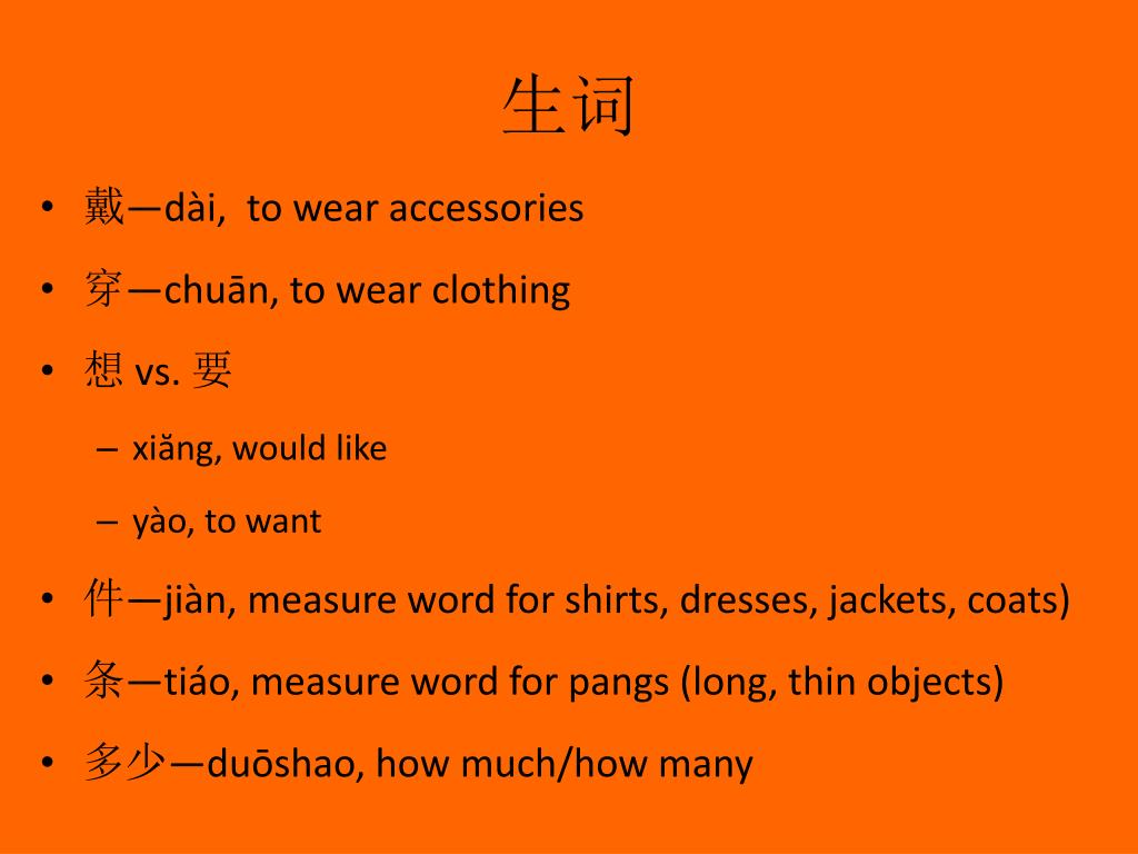 生词 • 戴—dài, to wear accessories • 穿—chuān, to wear clothing • 想 vs. 要 • xiăng, would like • yào, to want • 件—jiàn, measure word for shirts, dresses, jackets, coats) • 条—tiáo, measure word for pangs (long, thin objects) • 多少—duōshao, how much/how many