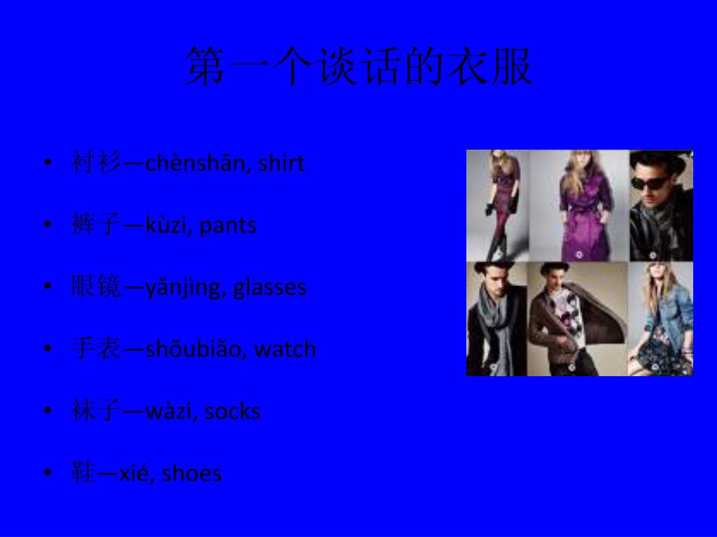 第一个谈话的衣服 • 衬衫—chènshān, shirt • 裤子—kùzi, pants • 眼镜—yănjìng, glasses • 手表—shŏubiăo, watch • 袜子—wàzi, socks • 鞋—xié, shoes