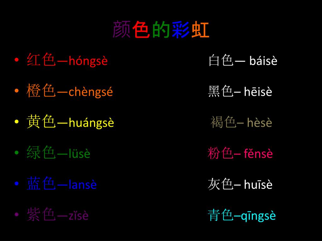颜色的彩虹 • 红色—hóngsè白色—báisè • 橙色—chèngsé黑色–hēisè • 黄色—huángsè 褐色–hèsè • 绿色—lüsè粉色–fěnsè • 蓝色—lansè灰色–huīsè • 紫色—zĭsè青色–qīngsè
