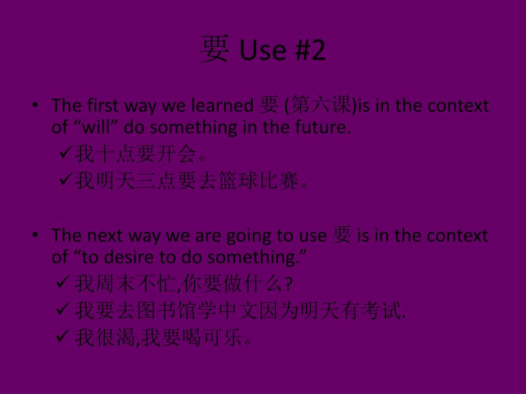 要 Use #2 • The first way we learned 要 (第六课)is in the context of “will” do something in the future. • 我十点要开会。 • 我明天三点要去篮球比赛。 • The next way we are going to use 要 is in the context of “to desire to do something.” • 我周末不忙,你要做什么? • 我要去图书馆学中文因为明天有考试. • 我很渴,我要喝可乐。